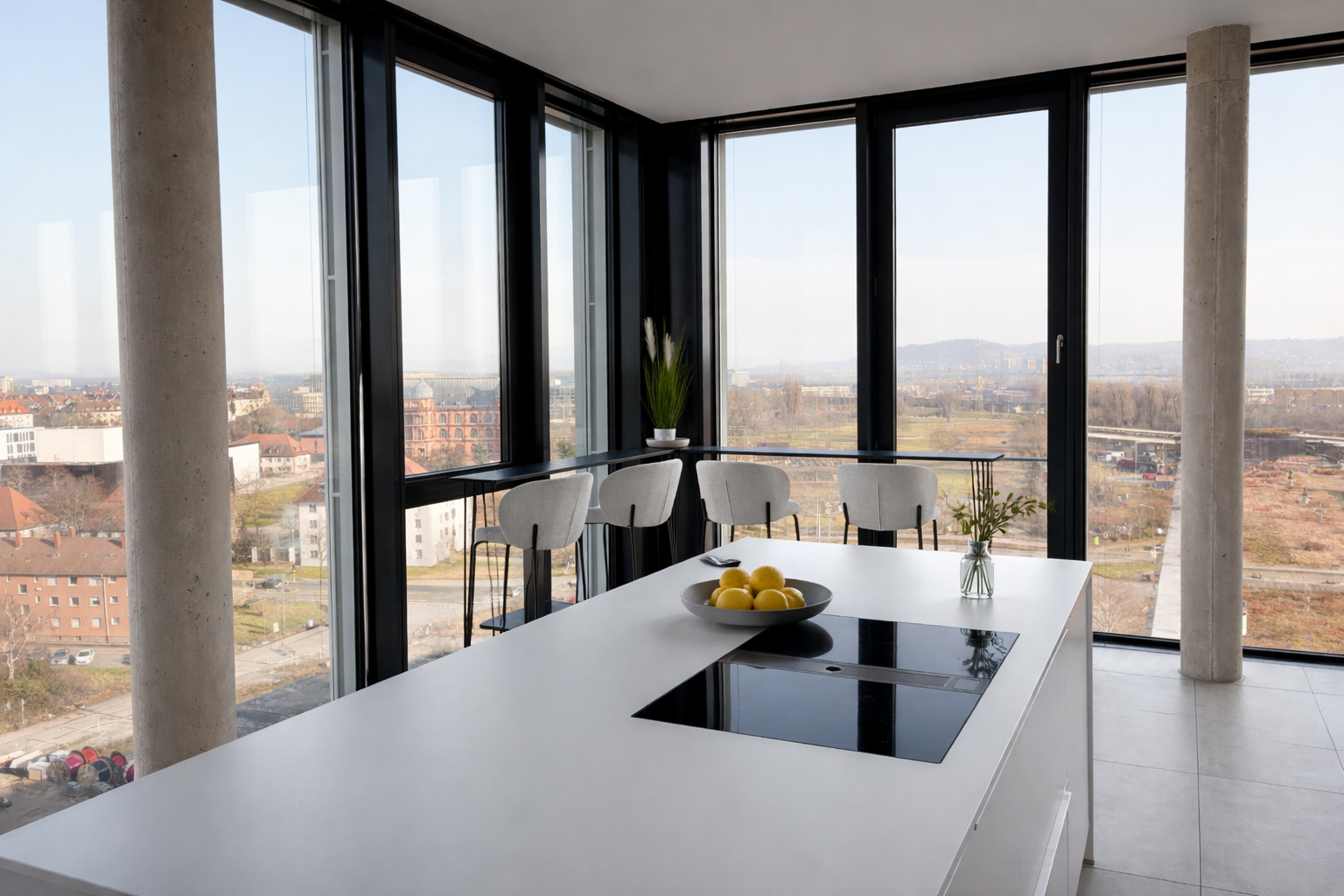 Unsere luxuriöse 140 m²-Wohnung im 10. Stock bietet sonnige Loggia, Sauna, freistehende Badewanne und eine eindrucksvolle Aussicht über Karlsruhe.